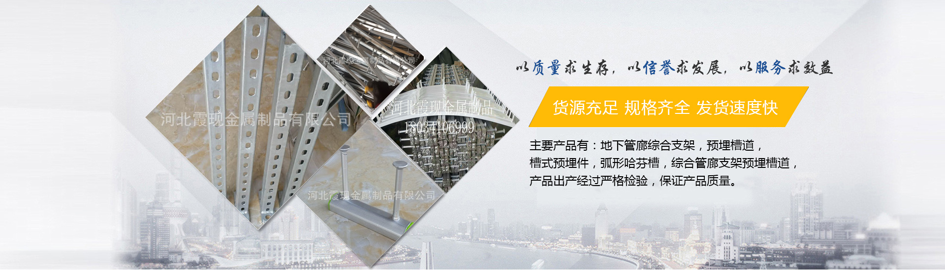 河北霞現(xiàn)金屬制品有限公司主要生產(chǎn):地下管廊綜合支架,高鐵預(yù)埋槽道,帶齒哈芬槽式預(yù)埋件,弧形哈芬槽,預(yù)埋槽道,V型預(yù)埋槽道 ,城市地下綜合管廊支架預(yù)埋槽道,C型槽式預(yù)埋件,高鐵槽道,高鐵哈芬槽道。公司生產(chǎn)的哈芬槽式預(yù)埋件質(zhì)優(yōu)價(jià)廉,哈芬槽主要型號(hào)有:.38*23*6000.50*25*6000.52*34*6000.30*20*6000.40*22*6000.72*48*6000.64*44*6000.41*26*6000.除普通哈芬槽外,還生產(chǎn)弧形哈芬槽,帶齒哈芬槽,管廊支架,托臂支架,41*41*2.0*2.3*2.5托臂/41*52*2.0*2.3*2.5/41*62*2.0*2.3*2.5/41*72*2.0*2.3*2.5托臂支架,U型螺栓鉚接高鐵哈芬槽,V型哈芬槽,燕尾型哈芬槽。河北霞現(xiàn)金屬制品有限公司生產(chǎn)的產(chǎn)品得到了廣大客戶(hù)的認(rèn)可和肯定,歡迎廣大客戶(hù)來(lái)電采購(gòu)我公司生產(chǎn)的哈芬槽預(yù)埋件!